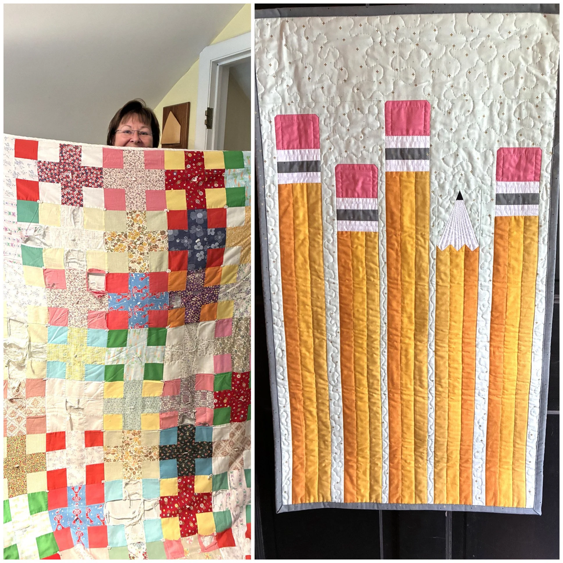 Meeting guild members who are kindred spirits is such fun! Entering Carrol Stovold’s home the other day it was clear I was meeting a quilter who believes in education and learning – on her door was a charming door banner of pencils just in time for the start of school! (A kit from Riley Blake). With no fuss she promptly led me up to the “bonus” room created in the old attic of the split level she and her husband have owned since 1985. Surrounded by her organized stash, sewing and cutting tables and many works in progress, I learned Carrol had a very similar sewing upbringing to me – and many of us I suspect.