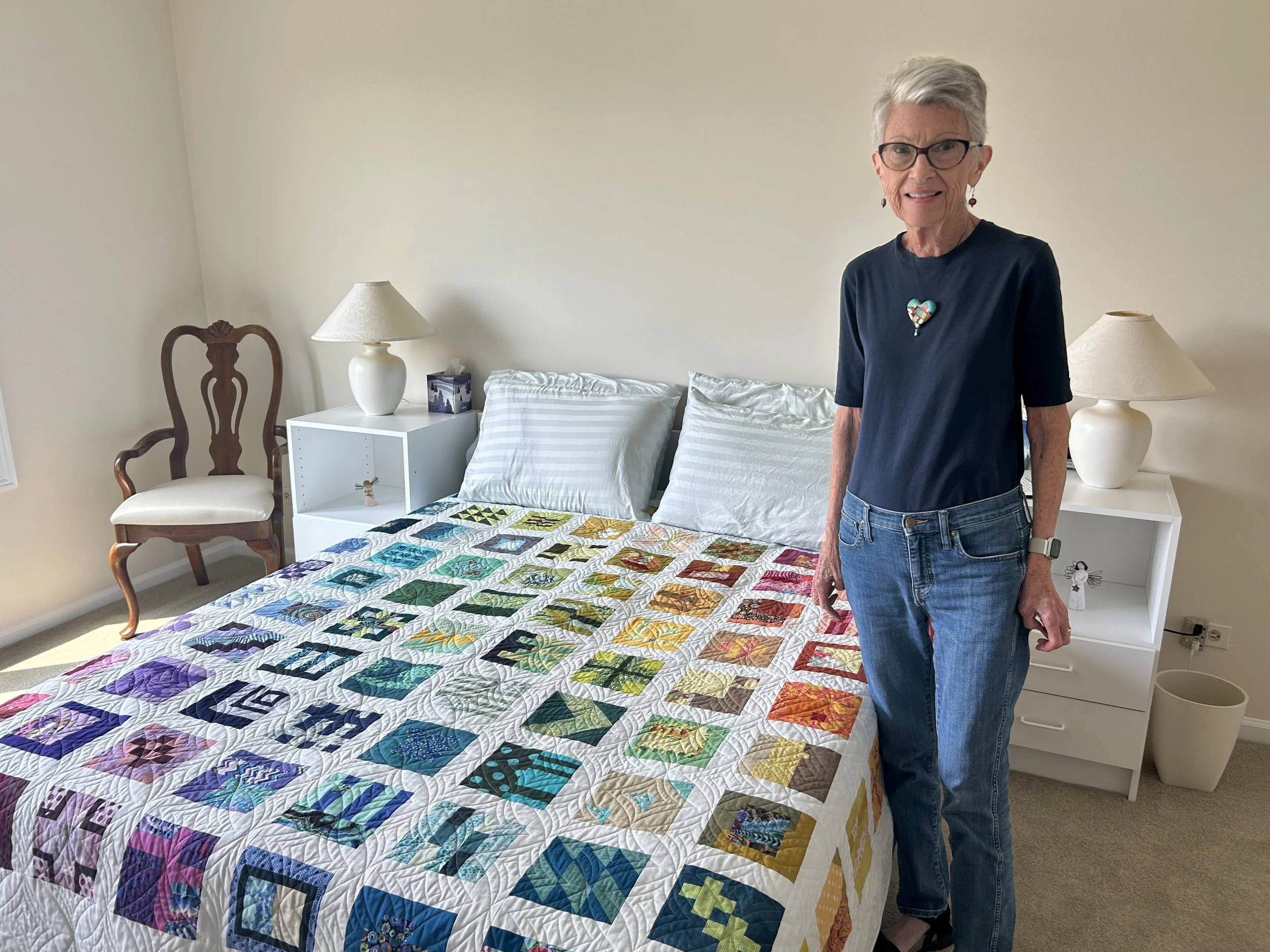 While she had done many types of needlework in 2017 she was inspired to learn more about quilting by fellow guild member and neighbor Susan Surdyk. Julie joined Village Quilters in 2019, just in time for the Bill Kerr workshop. She got involved right away with the guild by becoming Secretary of the guild and assisting on a Service Project for ALS patients. While Covid caused all of us much stress, Julie needed to remain isolated as she is immunocompromised due to anti-rejection meds she must stay on the rest of her life. So, thank goodness for a new passion and purpose! And for zoom! Being able to meet with fellow quilters, take classes, and continue to connect was a Covid blessing. Julie is grateful that when she is in Florida, she can still connect with Village Quilters for the winter meetings and any workshops that are held on Zoom.