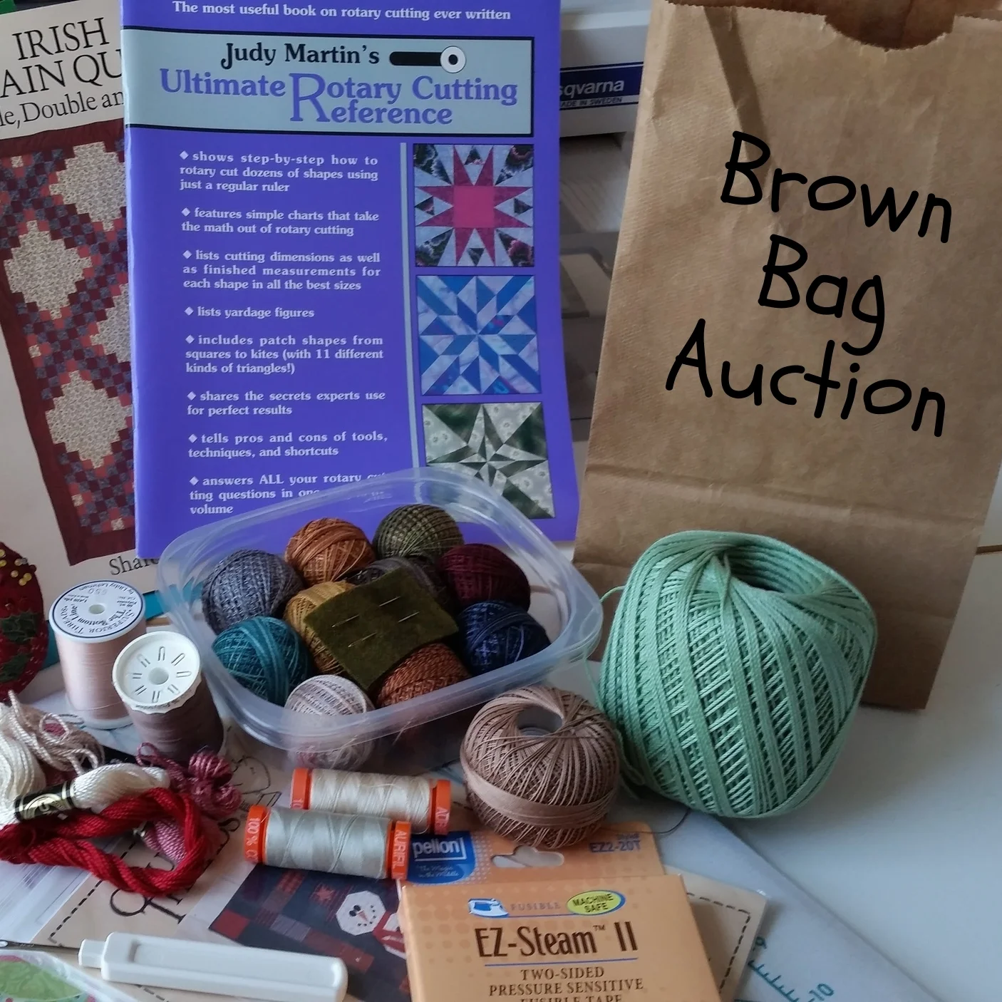 Equipment, Fabric, Yarn, Pillows, Lamps, Irons, Rulers, Patterns, Buttons, Thread, Beads, Sewing machines, Storage bins, Markers, Ribbon